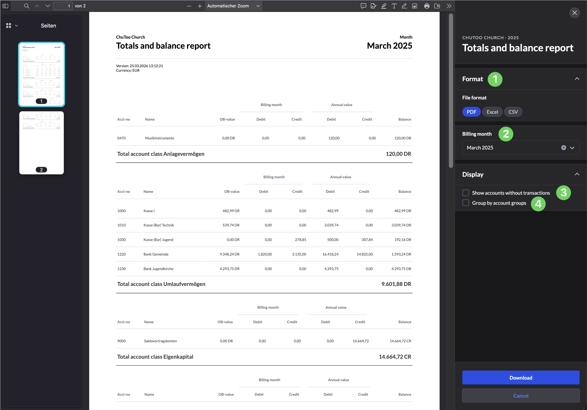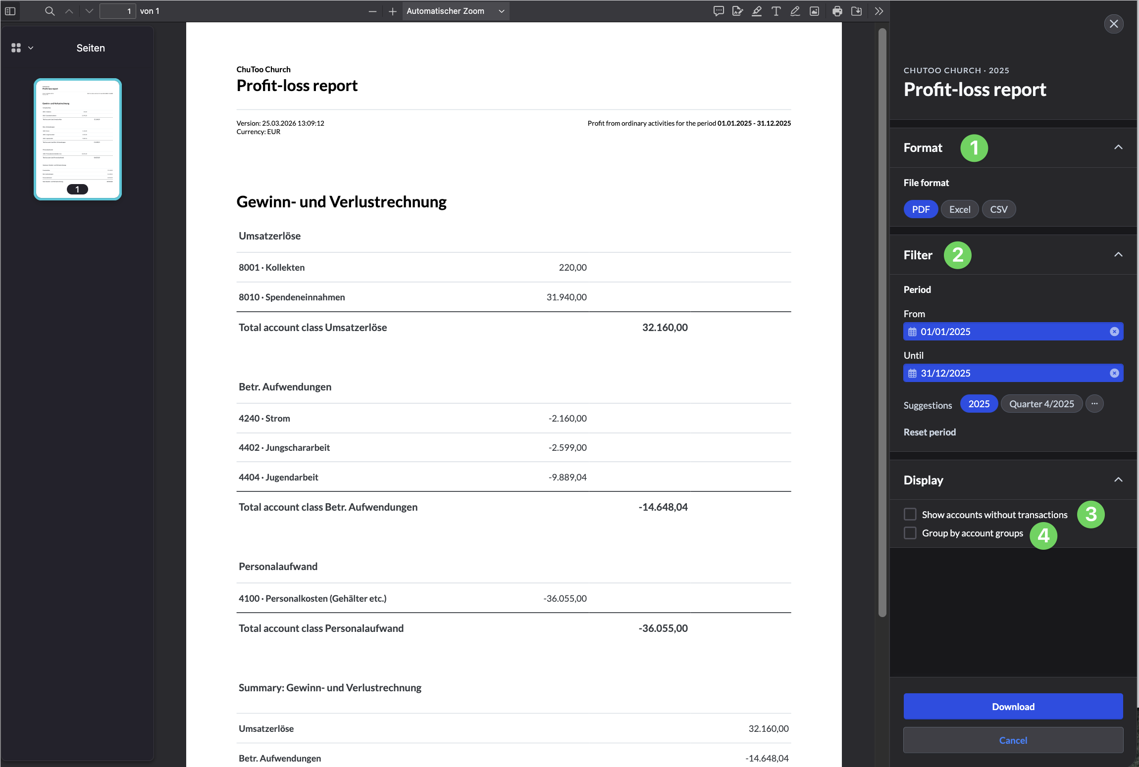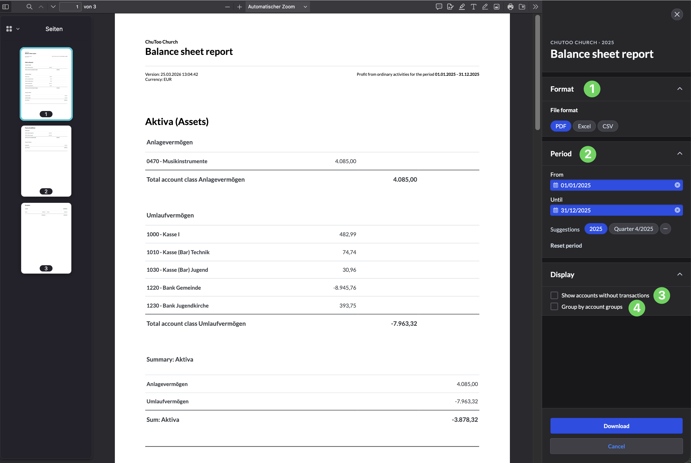 In the menu on the right-hand side, you can select the file format (1), limit the time period (2), hide certain accounts (3) or group accounts (4).
