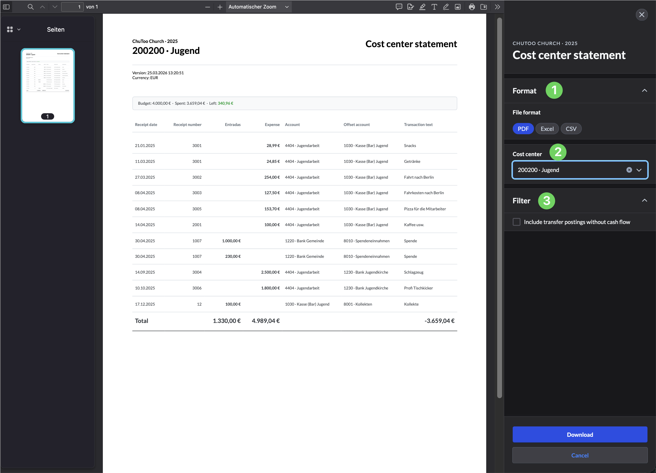 In the menu on the right-hand side, select the file format (1) and the cost center (2) for which you want the cost center statement to be displayed. Transfers without a payment flow (3) are filtered out by default – you can include them using the checkbox.