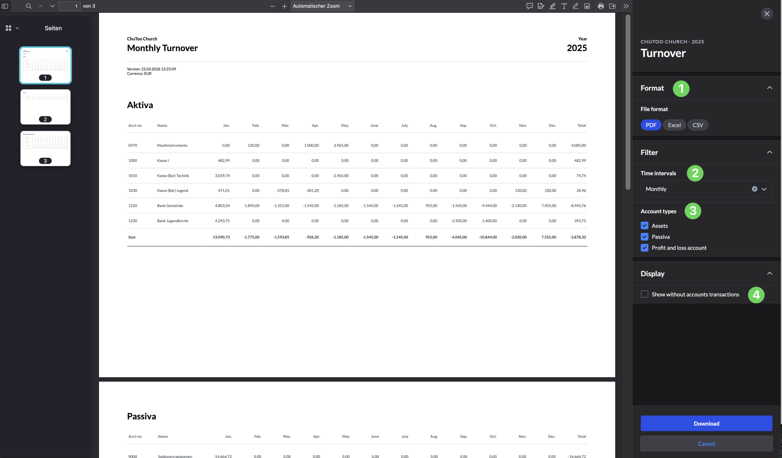 In the menu on the right-hand side, you can select the file format (1), time intervals (2) and account types (3) or hide certain accounts (3).
