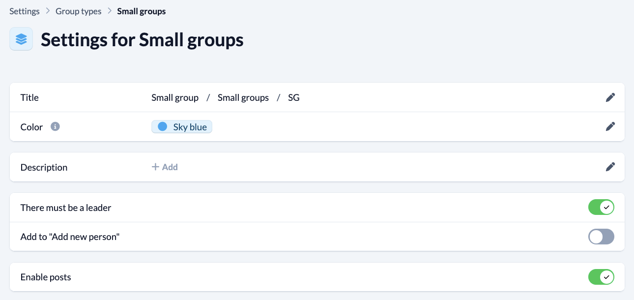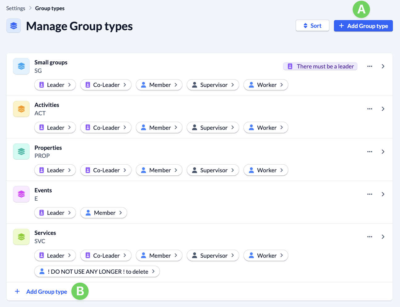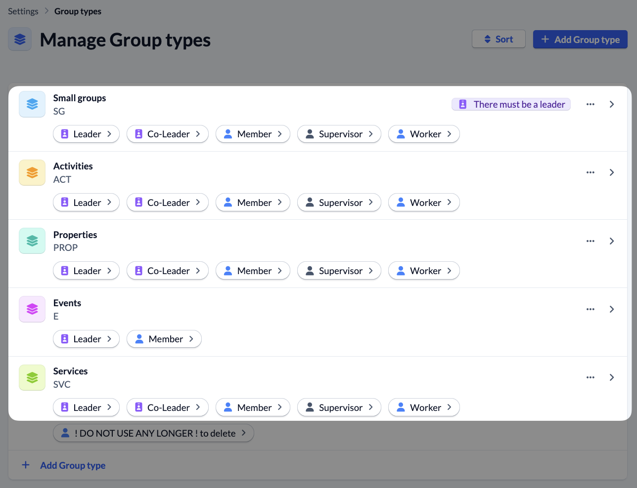 ChurchTools offers you the option of working with the four preset group types, changing them, deleting them or creating your own group types.
