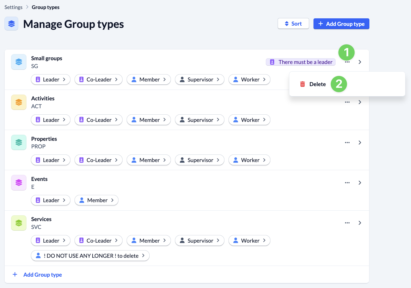 If you want to delete a group type, open the corresponding menu (1) and click on Delete (2).